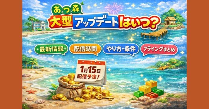 あつ森大型アップデート2026(Ver.3.0)はいつ配信?1月15日予定の最新情報、アップデート時間の目安、条件、やり方、フライングの可能性まで事前にまとめました。 はじめに 2026年に入り、「あつ森に大型アップデートが来る」という話題が一気に広がっています。久しぶりに島へ戻ろうか迷っている人や、事前に内容を把握しておきたい人も多いのではないでしょうか。 今回予定されているのは、2026年1月15日配信予定の大型無料アップデート(Ver.3.0)。「リゾートホテル」や「夢の島(第2の島)」など、これまで... -