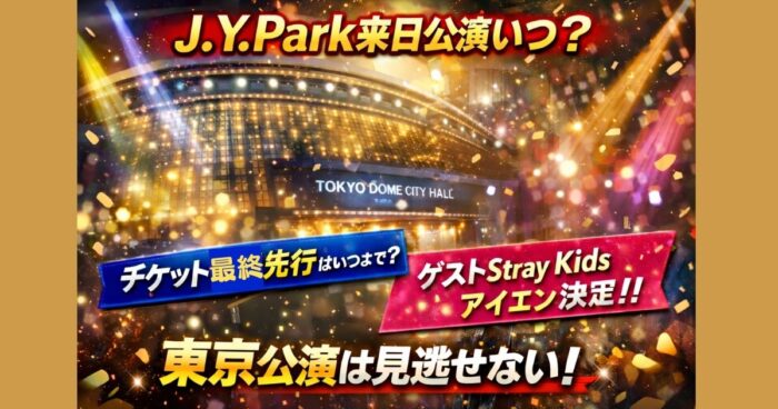J.Y. Park来日公演「HAPPY HOUR」開催日は2月5日。会場はTOKYO DOME CITY HALLで1公演のみ。Stray Kids I.N(アイエン)ゲスト出演や最終先行(ぴあ等)の締切目安、申込前の注意点をまとめます。 J.Y. Park待望の来日公演が決定!ゲストにStray Kids I.N出演で話題 K-POP界のレジェンドであり、JYPエンターテインメント創設者としても知られる**J.Y. Parkの来日公演が、2026年2月に開催されることが正式発表されました。今回の公演タイトルは「J.Y. PARK CONCERT “HAPPY HOUR” IN JAPAN」**。東京での単独公演は... -