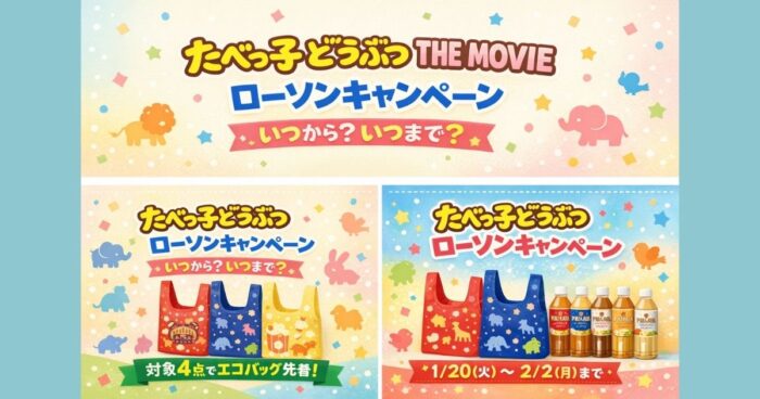 ローソン「たべっ子どうぶつ THE MOVIE」キャンペーンは1/20(火)7:00開始。対象商品4点購入でオリジナルエコバッグ(全3種)が先着でもらえる!期間・対象商品・注意点・対象外店舗をまとめ。 『たべっ子どうぶつ THE MOVIE』キャンペーンがローソンで開催! **「たべっ子どうぶつ THE MOVIE」の世界観を楽しめる、ファン必見のキャンペーンがローソン**でスタートします! 対象商品を4点購入するだけで、ここでしか手に入らない オリジナルエコバッグ(全3種) がもらえる先着キャンペーン。 数量限定・先着配布... -