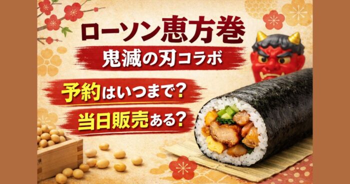 ローソンの恵方巻「鬼滅の刃コラボ」は予約が必要?予約締切日や当日店頭販売の有無、予約方法をわかりやすくまとめました。 今年も登場!ローソン×鬼滅の刃 恵方巻2026 「鬼滅の刃」恵方巻は毎年人気!数量限定だから 予約が安心・早めが基本。ローソン2026年の恵方巻ラインナップにも入っていて、 特典付きで注目度抜群。 2026年の恵方巻は、ローソンアプリや店頭で予約受付中です。全国のローソン各店で取り扱いがあり、節分シーズンに向けた恒例商品として今年もラインナップされています。 【数量限定/グッズ... -