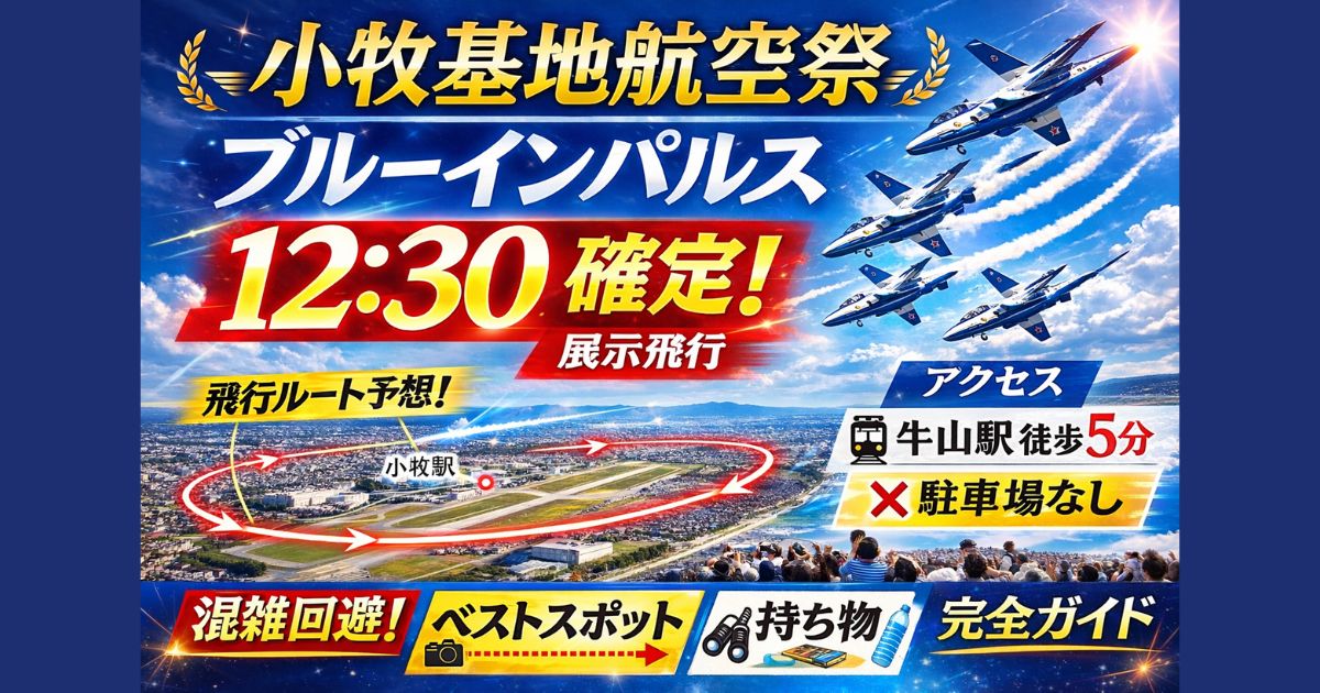 小牧基地航空祭2026は3月1日開催。ブルーインパルス展示飛行は12:30確定!市街周回の飛行ルート予想、牛山駅アクセス、駐車場なし対策、混雑回避のコツまで網羅。行く前に必読の完全ガイド。 はじめに 2026年3月1日(日)、愛知県の航空自衛隊 小牧基地で開催される航空祭。 今年はなんとブルーインパルスの展示飛行が確定! この記事では、 ・公式確定スケジュール・ブルーインパルス飛行時間・飛行ルート予想・アクセス&混雑回避・持ち物&注意点 を完全網羅します。 ブルーは午後に飛ぶ!小牧基地航空祭2026、... -