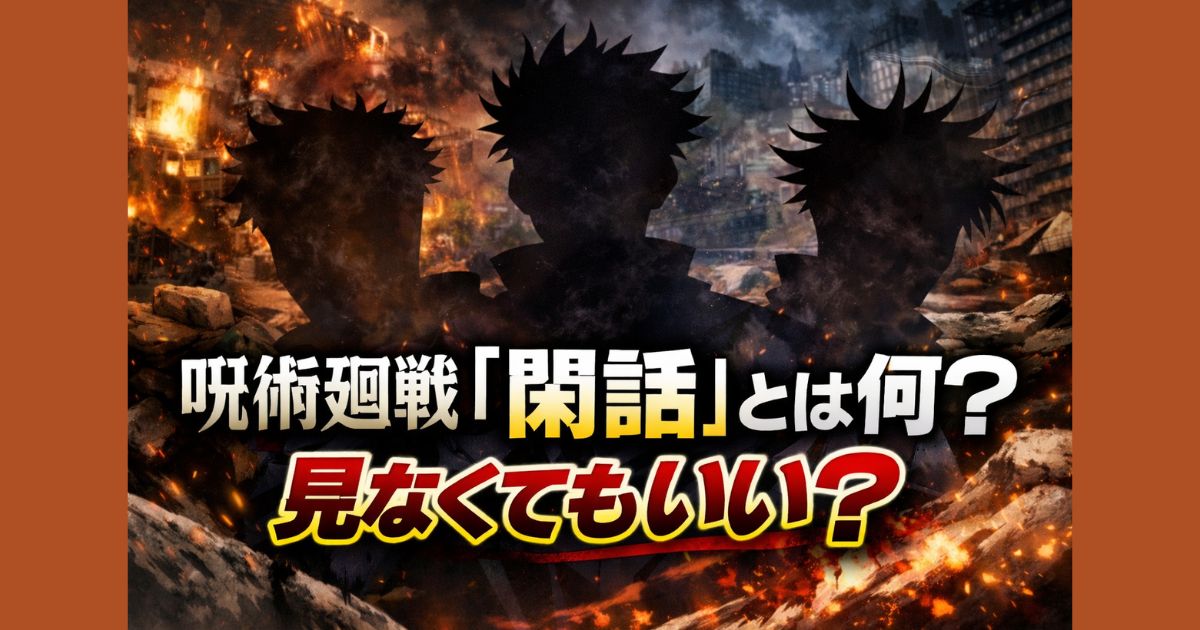 呪術廻戦アニメの「閑話」って何?見なくてもいい回?意味や総集編の内容、本編との違いを徹底解説。第3期「死滅回游 前編」の振り返りポイントも分かりやすくまとめました。 はじめに 「呪術廻戦」を見ていて、突然出てくる“閑話”という表示。 「これって本編?」「見なくてもいい回?」と疑問に思った人も多いですよね。 特に第3期「死滅回游 前編」でも放送され、話題になりました。 この記事では、 「閑話」の本来の意味 アニメでの位置づけ 過去の閑話の内容 本編との違い 見るべきかどうか を分かりやすくま... -