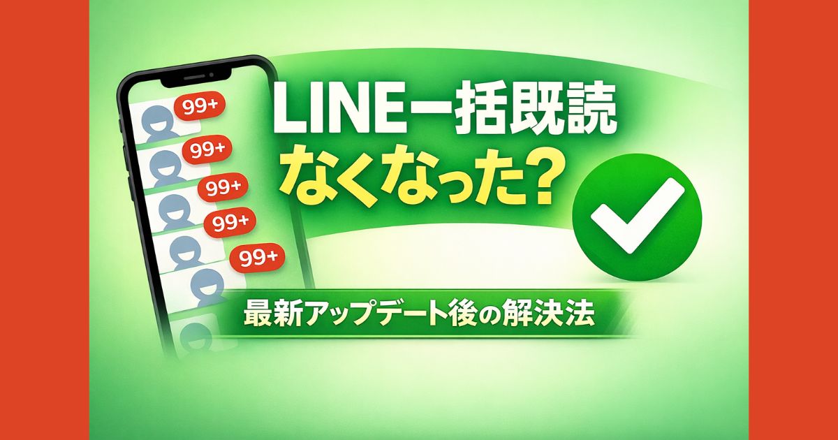 LINEの一括既読がなくなった?2026年2月最新アップデート後の正しいやり方を解説。「+」ボタンからの操作手順、表示されない時の対処法5選、PC版の方法まで分かりやすくまとめました。未読ストレスを今すぐ解消! はじめに 最近のLINEアップデートで、「一括既読ボタンが消えた!」と焦った人、多いですよね。 私も未読が大量にたまって、正直パニックでした…。 でも安心してください。一括既読はなくなっていません。場所が変わっただけです。 この記事では、最新バージョンでの正しいやり方を誰でもすぐ分かる... -