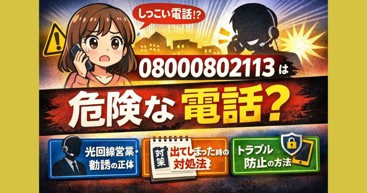08000802113(0800-080-2113)は危険な電話?光回線の営業・勧誘との口コミや実態、出てしまった場合の対処法と着信拒否・予防策をわかりやすく解説します。 はじめに 最近、「知らない番号からの着信が増えた…」と感じていませんか?中でも 08000802113(0800-080-2113) という番号は、検索すると多くの口コミが見つかり、不安になる人が続出しています。 調べてみると、光回線の営業電話として話題になっている番号で、「出てしまった」「しつこかった」「断るのが大変だった」という声も少なくありません。 こ... -