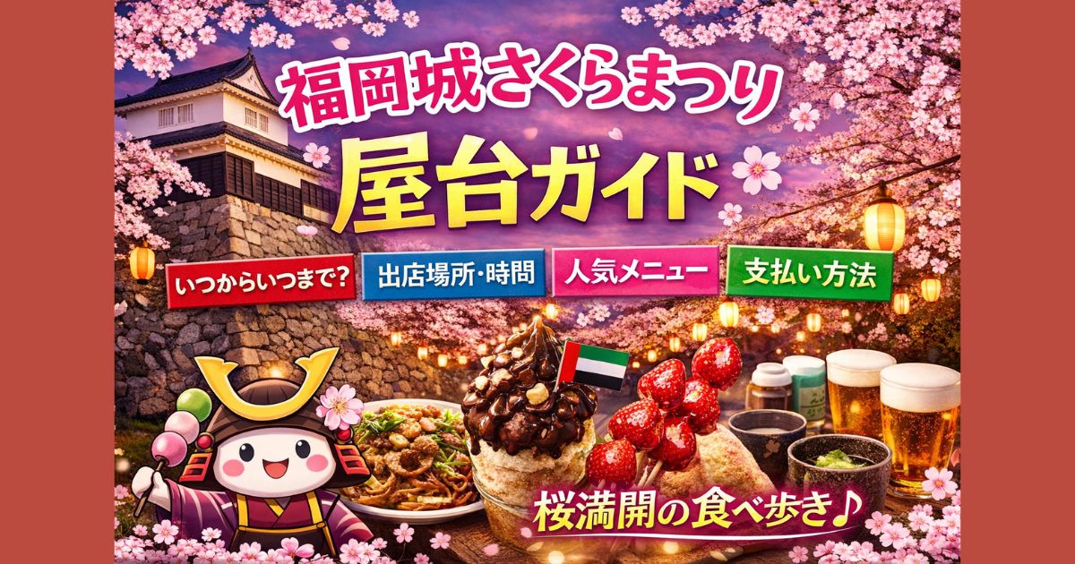 福岡城さくらまつり2026の屋台はいつからいつまで?出店場所・営業時間・人気メニュー・支払い方法を徹底解説。混雑回避のコツやアクセス情報もまとめました。春の舞鶴公園を満喫する完全ガイド。 はじめに 福岡城さくらまつりの屋台情報を徹底的に調べてみました。2026年の公式詳細はまだ発表されていませんが、過去の開催実績や開花予想から日程や内容を予想。 舞鶴公園で約1000本の桜が咲き誇る中、約40~70店舗の屋台が並ぶ春のビッグイベントです。屋台の営業時間、出店場所、人気メニュー、支払い方法まで、... -