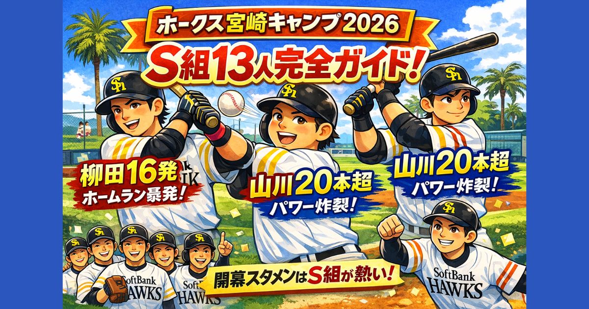 福岡ソフトバンクホークス宮崎キャンプでS組13人が本格合流。柳田悠岐16本柵越え、山川穂高20本超アーチなど圧巻の打撃内容と紅白戦の活躍、最新調子を徹底まとめ。開幕スタメン争いの現状も解説。 はじめに 福岡ソフトバンクホークスの宮崎春季キャンプで、主力が集う「S組」が本格合流。 第4クールから一気にチームの空気が変わりました。 柳田&山川の柵越え連発、紅白戦での存在感 開幕へ向けた現在地を分かりやすく整理します。 S組13人メンバー一覧 S組は主力中心の特別調整組。2月14日から生目の杜運動公園... -