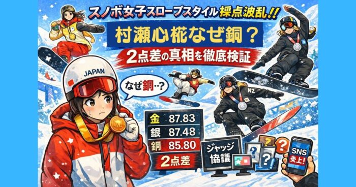 ミラノ・コルティナ五輪のスノボ女子スロープスタイル決勝で“採点波乱”が話題になっています。銅メダルの村瀬心椛に対し「なぜ銅?」「点数が低すぎるのでは?」という声が急増。わずか2点差で金を逃した背景には何があったのでしょうか。金メダルの深田茉莉、銀のゾイ・サドフスキシノットとの評価の違いを、ルールや採点基準、ネットの反応をもとに整理します。 あの3本目、金メダル級じゃなかった? そんなモヤモヤの真相を一つずつ見ていきましょう。 スノボ女子スロープスタイルの採点基準とは? スロープス... -