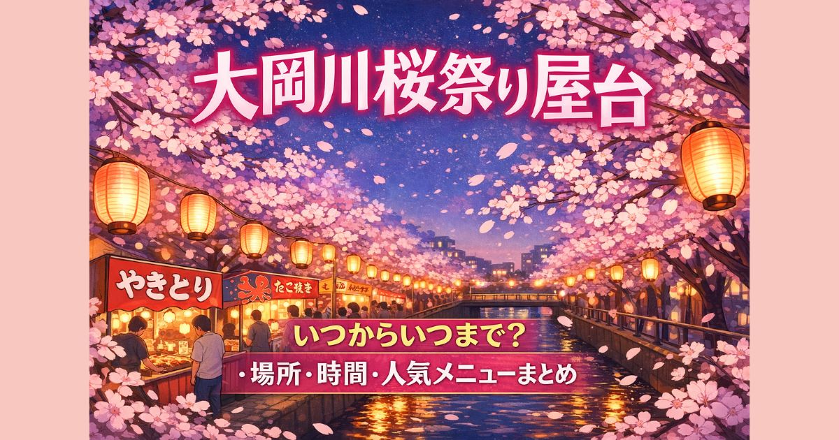 大岡川桜祭り屋台2026の開催期間は?場所や時間、人気メニュー、支払い方法を最新情報と過去傾向から解説。夜桜ライトアップや混雑回避のコツもまとめました。 はじめに 大岡川の桜祭り、毎年横浜の春を彩る人気イベントですよね。今年2026年は3月下旬から4月上旬までの約2週間が開催予想で、屋台も満開の桜並木を背景にずらりと並びます。場所は大岡川プロムナード沿い、弘明寺商店街や観音橋周辺が賑わいの中心。営業時間は11時頃から21時頃まで、夜のライトアップタイムが特におすすめです。 この記事では、屋... -