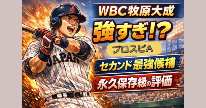 プロスピAのWBC牧原大成(2025 S2侍)は強い?能力評価・おすすめ称号・長期運用の価値を徹底解説。セカンド候補としての実力やガチャで引くべきかを分かりやすく紹介。 はじめに プロスピAの侍ジャパン第2弾で登場した牧原大成(2025 S2侍)について、 「実際どれくらい強いのか?」「長く使える選手なのか?」 と気になる方も多いと思います。 この記事では、攻略サイト(Game8など)をもとに 能力評価 特能の強さ おすすめ称号 長期運用の価値 ガチャで狙うべきか を、客観的に整理して解説します。 プロスピA... -