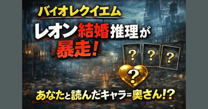 バイオハザード レクイエムで話題のレオン結婚説。エンディングコンセプトアートの薬指リングから始まった考察と、SNSで広がった「あなたと読んだキャラ=奥さん」ミームをわかりやすく解説します。 はじめに 『バイオハザード レクイエム』で突然話題になったレオンの薬指リング。その考察はファンの間で急速に広がり、ついにはSNSで 「あなたと読んだキャラ=レオンの奥さん」 というカオスなミームまで生まれる事態になりました。 発端は、ゲーム内で確認できるエンディングコンセプトアートに描かれた指輪。そ... -