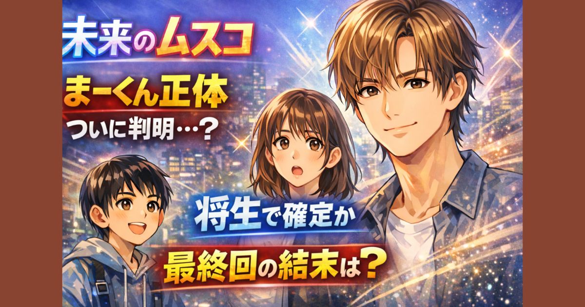 未来のムスコの「まーくん」の正体は誰?第9話までの展開から将生が最有力とされる理由を徹底解説。最終回の結末予想や伏線、SNSの反応も分かりやすくまとめています。 はじめに TBS火曜ドラマ『未来のムスコ』が、いよいよ最終回直前となり大きな話題になっています。 第9話まで放送され、「まーくん」の正体は誰なのか、視聴者の考察もかなり盛り上がってきました。 特に最新話では、未来と将生の関係が大きく動き、“まーくん=将生説がかなり濃厚になった” と感じた人も多かったはずです。 この記事では、 『未... -
