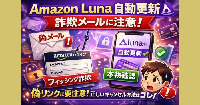 Amazon Lunaの自動更新メールは詐欺?急増中のフィッシングの見分け方と安全な確認方法、正しいキャンセル手順を解説。リンクは危険?本物との違いも徹底チェック! はじめに 最近、「Amazon Lunaの自動更新」に関するメールが急増しています。「年間プランの更新案内」という件名で届き、思わずリンクをクリックしそうになる内容ですが、実はその多くがフィッシング詐欺だとSNSや知恵袋で指摘されています。 特に2026年3月下旬頃から報告が急増しており、実際にAmazonを利用していない人にも届いていることから、... -