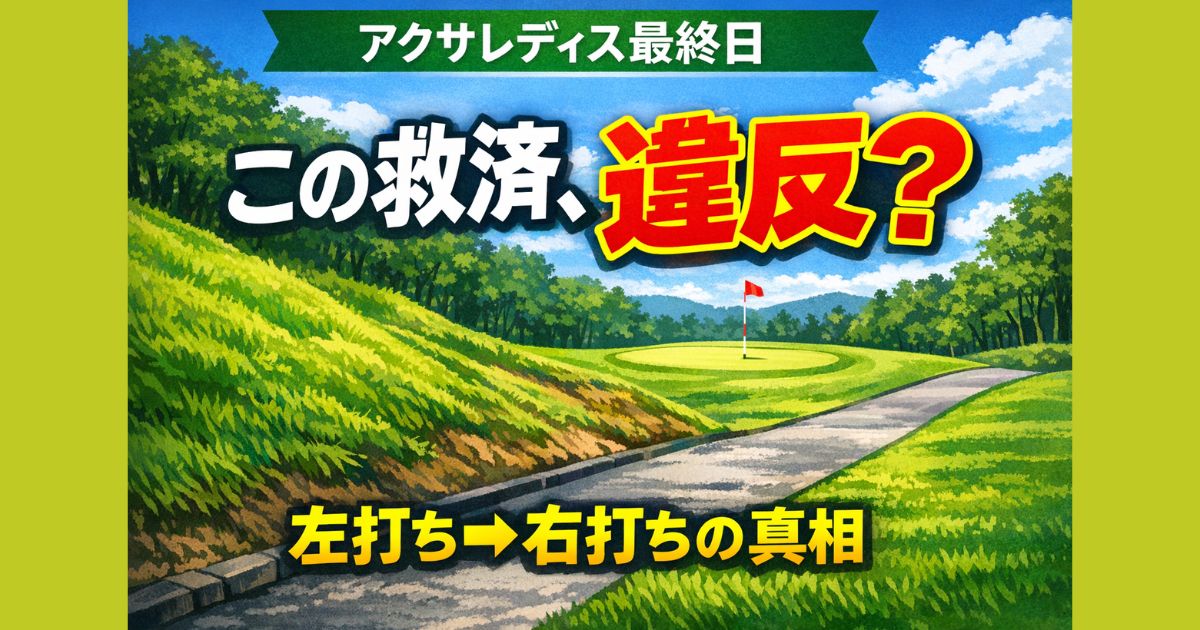 アクサレディス最終日で話題となった申ジェの救済はルール違反なのか?18番ホールでの左打ち前提のニアレストポイント設定と、その後の右打ちプレーの真相を分かりやすく解説。競技委員の判断やルール上の扱い、なぜ物議になったのかまで徹底整理します。 事件の概要とシーンの全体像 アクサレディスゴルフトーナメント最終日、18番ホールで起きた申ジェ選手の第3打の判断が大きな注目を集めました。焦点となったのは、急斜面ラフからのプレーと、その後に選択された救済処置です。 ボールはグリーン手前の傾斜の... -