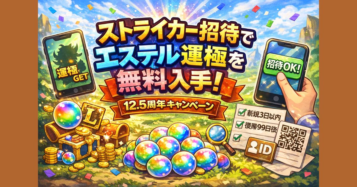 モンスト12.5周年のストライカー招待キャンペーンを徹底解説。エステル運極を無料で入手する方法や招待のやり方、条件、掲示板活用、自演のコツまで完全ガイド。初心者でもすぐできる手順をわかりやすく紹介します。 はじめに モンストの12.5周年を記念して開催中の「ストライカー招待キャンペーン」が、いま大きな話題になっています。このキャンペーンでは、条件を満たしたユーザー同士で招待を成立させるだけで、強力なキャラ「エステル」の運極が無料で手に入ります。 しかも報酬は招待した側だけでなく、招待... -