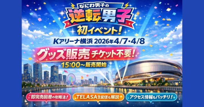 なにわ男子「逆転男子」初イベント(Kアリーナ横浜4/7-8)の最新情報。グッズ販売はチケット不要で15時開始。完売回避のコツ、販売時間、配信(TELASA)、アクセスまで完全ガイド。 はじめに なにわ男子の冠番組「逆転男子」が、ついに初の大型イベントを開催します。2026年4月7日・8日に行われる舞台は、話題の大型会場・Kアリーナ横浜です。 観覧チケットはすでに完売していますが、今回の大きなポイントはグッズ販売がチケットなしでも利用できることです。 さらに配信情報やアクセス、当日の立ち回りまで押さ... -
