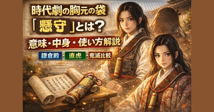 時代劇で女性が胸元に下げる「懸守(かけまもり)」とは何かをわかりやすく解説。平安時代から続く歴史や意味、「鎌倉殿の13人」「おんな城主直虎」での役割、鬼滅の刃・禰豆子との違いまで徹底解説します。 はじめに 最近、時代劇や大河ドラマを観ていると、女性が胸の前に細長い袋のようなものを下げているシーンが気になりませんか。 巻物のようにも見えるあの小物は、実は「懸守(かけまもり)」と呼ばれる伝統的なお守りで、平安時代から続く歴史あるアイテムなんです。 鎌倉殿の13人やおんな城主 直虎でよく... -