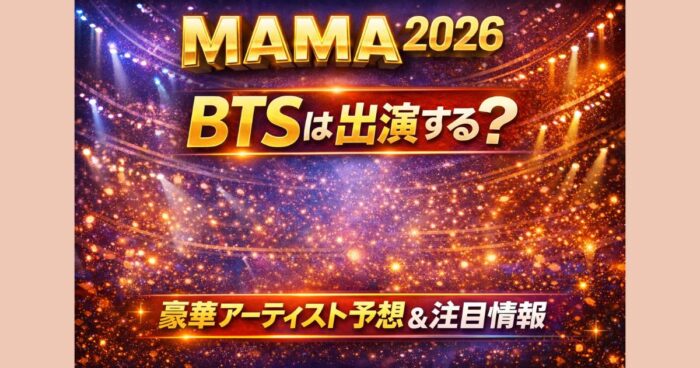 MAMA2026の出演者は誰?BTSは出るのかを徹底解説。aespa・SEVENTEEN・Stray Kids・NewJeansなど有力候補を予想一覧で整理し、出演者発表時期や確認方法も分かりやすくまとめています。 はじめに MAMA2026の出演アーティストが誰になるのか、気になって検索している人も多いはずです。特に「BTSは出るのか?」という点は、今回の大きな注目ポイントになっています。 2026年は大阪・京セラドームでの開催が決定しており、日本開催ということもあって、例年以上に豪華なラインナップが期待されています。ただし、現時... -