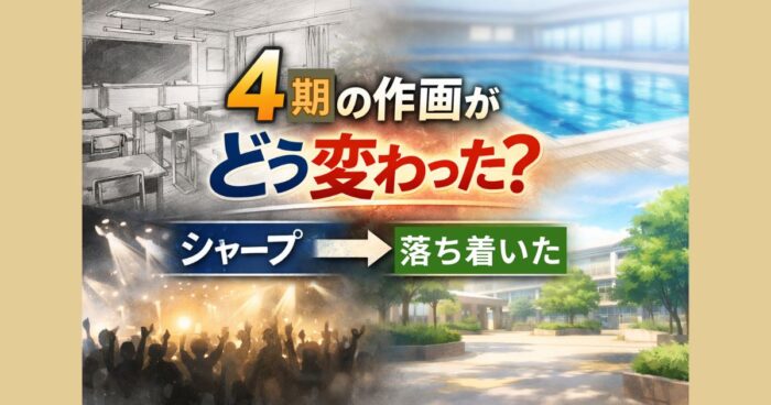 ようこそ実力至上主義の教室へ4期の作画が変わった理由を解説。線画がボヤけた原因や色味の変化、視聴者の評判、作画崩壊ではない理由まで分かりやすくまとめています。 はじめに 2026年4月から放送がスタートした『ようこそ実力至上主義の教室へ』4期。 正式には「2年生編1学期」として、新章に突入したことで注目を集めていましたが、放送開始後に特に話題になっているのが“作画の変化”です。 SNSや動画サイトでは、 「前と雰囲気が違う」「線画がボヤけて見える」 といった声が多く見られています。 ただし、こ... -