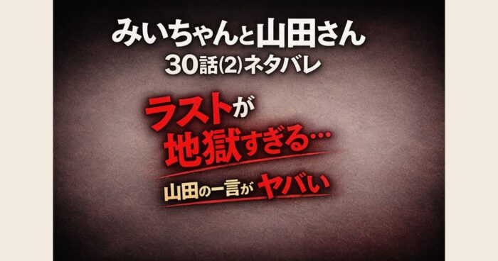 「みいちゃんと山田さん」30話(2)のネタバレ感想まとめ。ラストの衝撃展開や「これしかできない」の意味、山田の変化を読者反応とともに考察。重すぎる理由も分かりやすく解説します。 はじめに 「みいちゃんと山田さん」30話(2)が公開され、ラストシーンが“地獄すぎる”とSNSを中心に大きな話題になっています。特に「これしかできない」というセリフと、山田さんのある一言が強烈すぎると、多くの読者が衝撃を受けているようです。 本記事では、実際に読んでいない方でも分かるように、ブログやSNS、動画の反応を... -