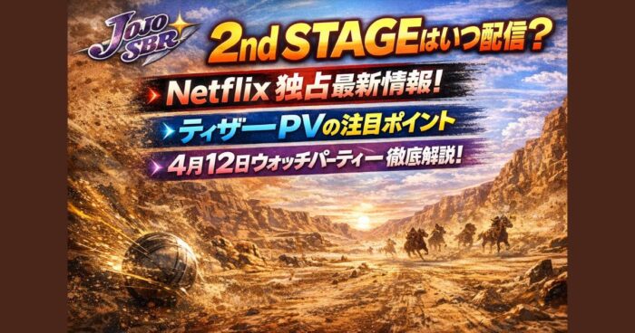 ジョジョ第7部「スティール・ボール・ラン」2nd STAGEが2026年秋Netflixで独占配信決定。ティザーPVの見どころや、4月12日開催のウォッチパーティー生配信の詳細をわかりやすく解説します。 はじめに ジョジョの奇妙な冒険第7部「スティール・ボール・ラン」のアニメ続編「2nd STAGE」の配信が正式に発表され、ファンの間で大きな注目を集めています。 さらに、2026年4月12日には「1st STAGE」を振り返るウォッチパーティー生配信も決定しており、今からでもしっかり追いつける環境が整っています。 この記事では... -