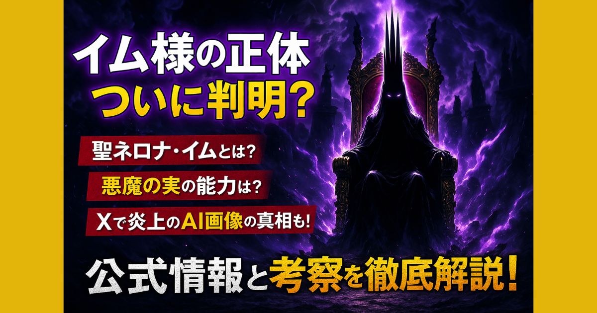 ワンピースのイム様は正体判明した?1179話の最新情報をもとに「ネロナ・イム」や能力考察、Xで炎上したAI画像の真相を公式と考察に分けて徹底解説します。 はじめに 最近、『ONE PIECE』ファンの間で、イム様をめぐる話題が一気に加熱しています。 Xでは「聖ネロナ・イム」「最初の20人の一人」「悪魔の実の能力者」といった情報が急速に拡散され、知恵袋などでも「本当なのか?」という検証の声が相次いでいます。 特に注目されているのが、1179話の内容とされる情報や、リアルすぎるイム様の画像です。 本記事... -
