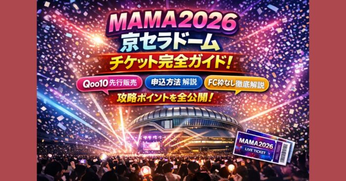 MAMA2026が京セラドーム大阪で開催決定。チケットはQoo10独占販売でFC先行なしの平等抽選。先行スケジュール予想、申込方法、当選率を上げるコツまで分かりやすく解説します。 はじめに MAMA2026の開催が京セラドーム大阪に決定し、K-POPファンの間で大きな話題となっています。2026年11月20日・21日の2日間にわたり、世界的アーティストが集結する大型授賞式イベントが日本で開催される予定です。 チケットはどうやって取るのか、先行はいつから始まるのか、ファンクラブ枠はあるのか。気になるポイントを過去の... -
