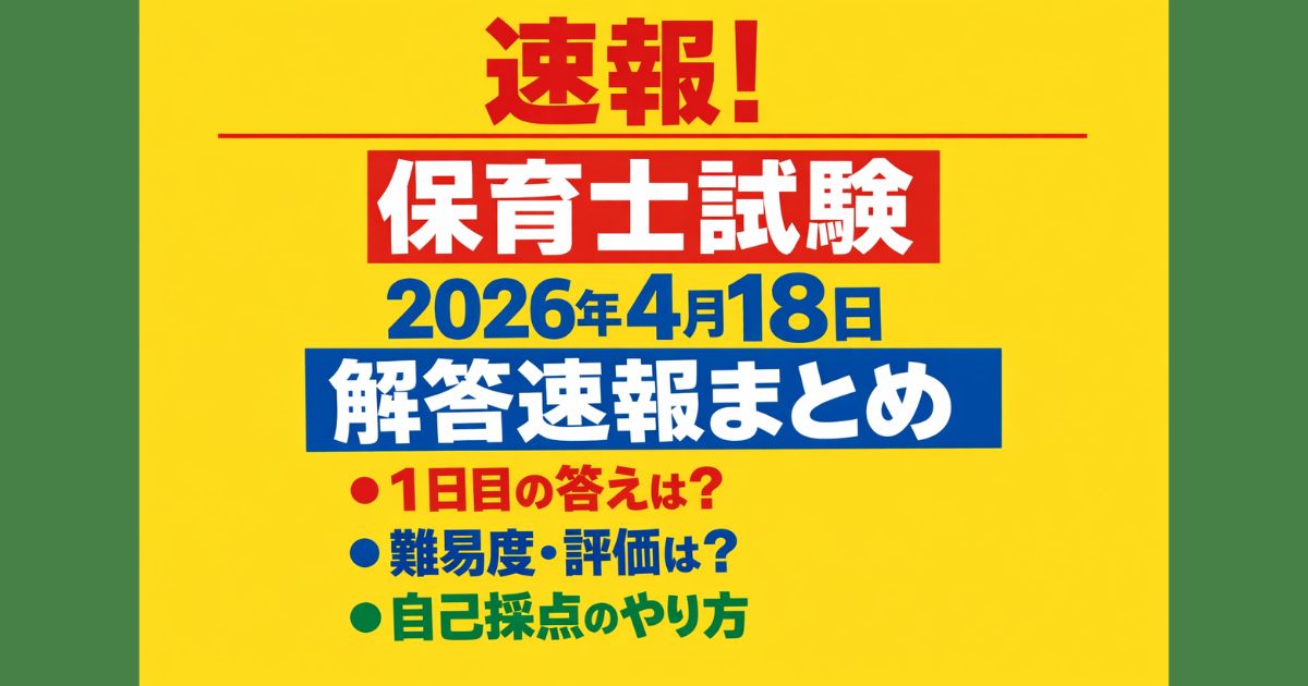 令和8年前期保育士試験(2026年4月18日)筆記の解答速報を掲載。1日目3科目の答え・難易度・自己採点のやり方をわかりやすく解説。速報サイトの確認方法や受験生のリアルな声、2日目対策までまとめてチェックできます。 はじめに こんにちは。令和8年前期保育士試験が、2026年4月18日からスタートしました。 この試験は、厚生労働省委託のもと中央保育士養成協議会が実施する国家資格試験で、筆記は全9科目を2日間に分けて行われます。 今回は、1日目に実施された筆記試験の解答速報を中心に、難易度の傾向や受験... -