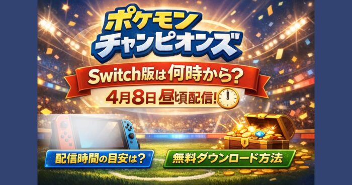 『ポケモンチャンピオンズ』Switch版は何時から?2026年4月8日昼頃の配信時間の目安や無料ダウンロード方法、ゲーム内容・スターターパック特典まで最新情報をわかりやすく解説します。 はじめに 本日2026年4月8日、Nintendo Switch版『Pokémon Champions(ポケモンチャンピオンズ)』がついに配信されます。 昼頃からNintendo eShopで無料ダウンロードが可能となり、ポケモンバトルに特化した新作として大きな注目を集めています。 ただし今回もっとも気になるのが「何時から配信されるのか」という点です。 結論... -
