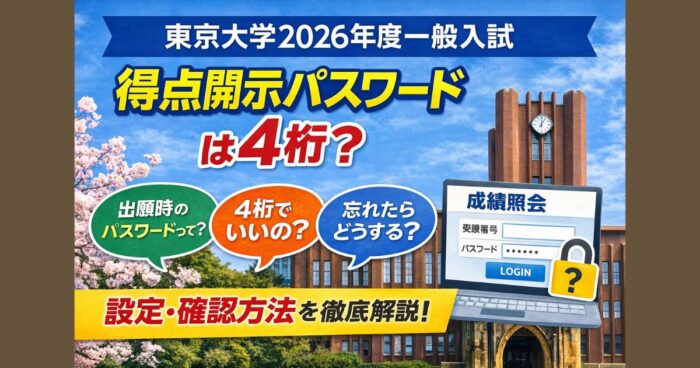東京大学2026年度一般入試の得点開示パスワードは4桁?出願時設定の仕組みや確認方法、忘れた場合の対処法をわかりやすく解説。4月1日開始のウェブ成績照会の注意点も網羅した最新版ガイドです。 はじめ 東京大学2026年度一般入試の得点開示が、2026年4月1日からスタートしました。 今年は従来のハガキ郵送が廃止され、ウェブ上で成績を確認する方式に変更されています。 その影響で今もっとも多い疑問がこちらです。 ・パスワードは何を使う?・4桁の数字でいいの?・出願時のやつってどれ? 出願から約2か月経っ... -