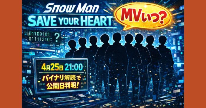 Snow Manの13thシングル「BANG!! / SAVE YOUR HEART / オドロウゼ!」が話題に。バイナリコードで発表された「SAVE YOUR HEART」MV公開日(2026年4月25日21時)の全貌や解読方法、楽曲の魅力、ファンの反応まで分かりやすく解説します。 はじめに Snow Manの13thシングル「BANG!! / SAVE YOUR HEART / オドロウゼ!」が、2026年春の音楽シーンで大きな話題を集めています。 今回の作品はグループ初となるトリプルA面シングルで、3曲すべてに主演タイアップが付くという豪華な構成が特徴です。 中でも注目されたの... -