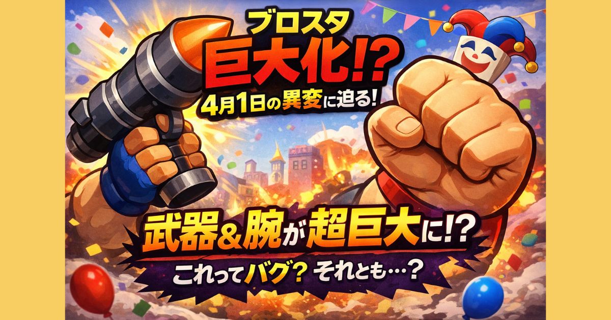 ブロスタで4月1日にキャラの腕や武器が巨大化する現象が発生。バグなのかエイプリルフール仕様なのか、原因や影響、終了時期を公式情報と過去傾向をもとに分かりやすく解説します。