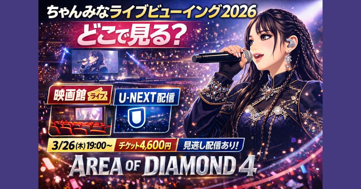 ちゃんみな「AREA OF DIAMOND 4」ファイナル公演のライブビューイング&U-NEXT配信を徹底解説。チケット料金4,600円、予約方法、上映館、見逃し配信期間(〜4月9日)まで分かりやすくまとめました。