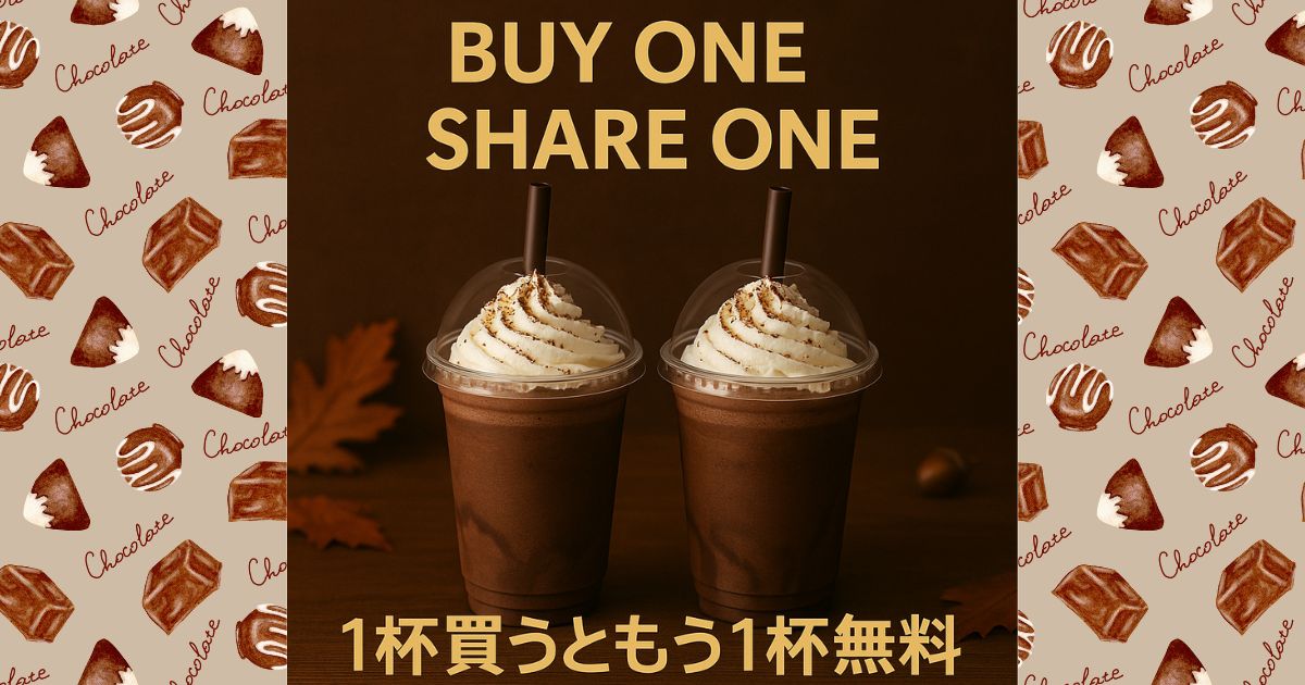 ショコリキサー BUY ONE SHARE ONE キャンペーンは、対象ドリンクを購入すると、同じドリンク(レギュラーサイズ)が無料になる企画です。