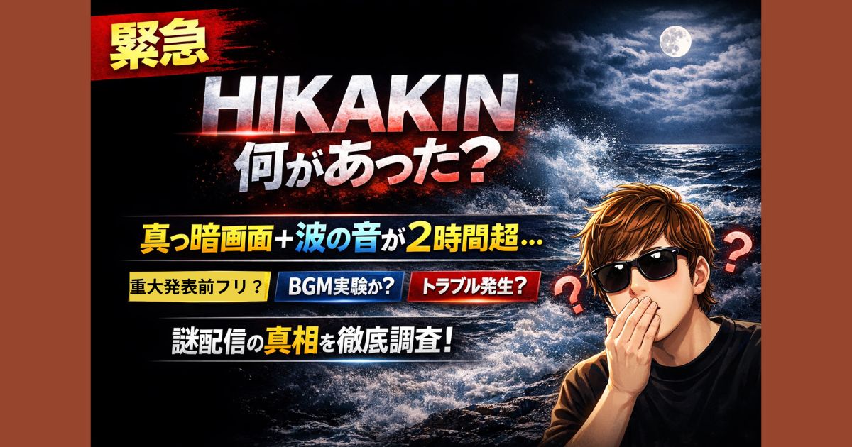 HIKAKINのYouTubeで突如始まった「真っ暗画面+波の音だけ」の謎配信が話題に。2時間超の異常な待機状態の真相は?SNSの反応や過去事例をもとに、前フリ説・BGM実験説・トラブル説を徹底解説します。