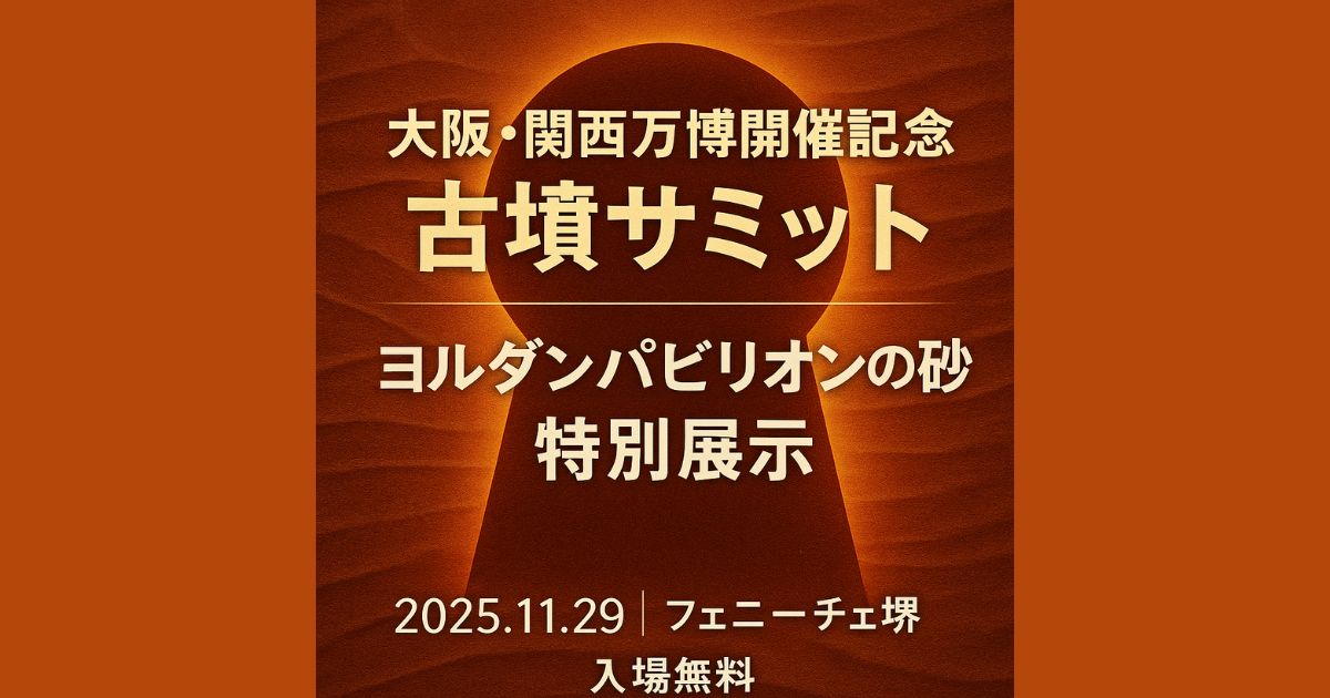 「大阪・関西万博開催記念 古墳サミット」(11/29)では、万博参加国からヨルダンとインドの遺跡をご紹介。抽選で気球搭乗チケットをプレゼント、ただいま講演の申込受付中です!ヨルダンパビリオンの砂も登場します(申込不要)🙌