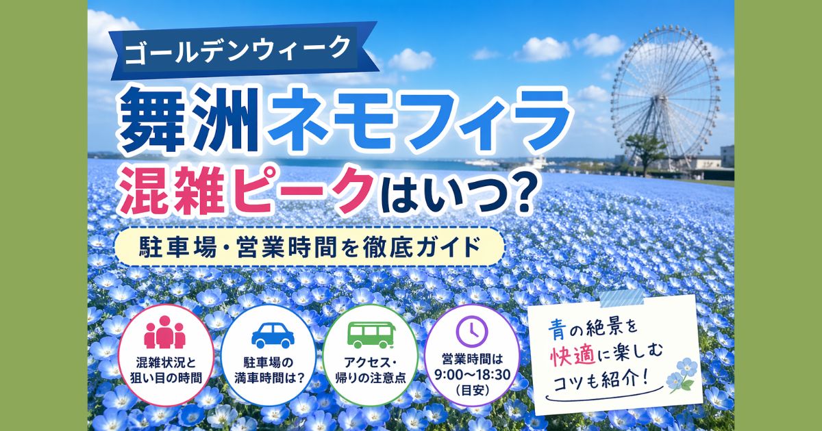 大阪ま舞洲シーサイドパークで開催される「ネモフィラ祭り2026」は、4月11日〜5月10日まで開催される春の人気イベントです。特にゴールデンウィーク期間(5月2日〜6日)は来場者が一気に増え、混雑や駐車場問題が気になる方も多いはず。この記事では、2026年GWの混雑状況、ピーク日、駐車場、営業時間まで最新情報ベースでわかりやすくまとめました。事前に知っておくだけで当日の動きやすさが大きく変わります。