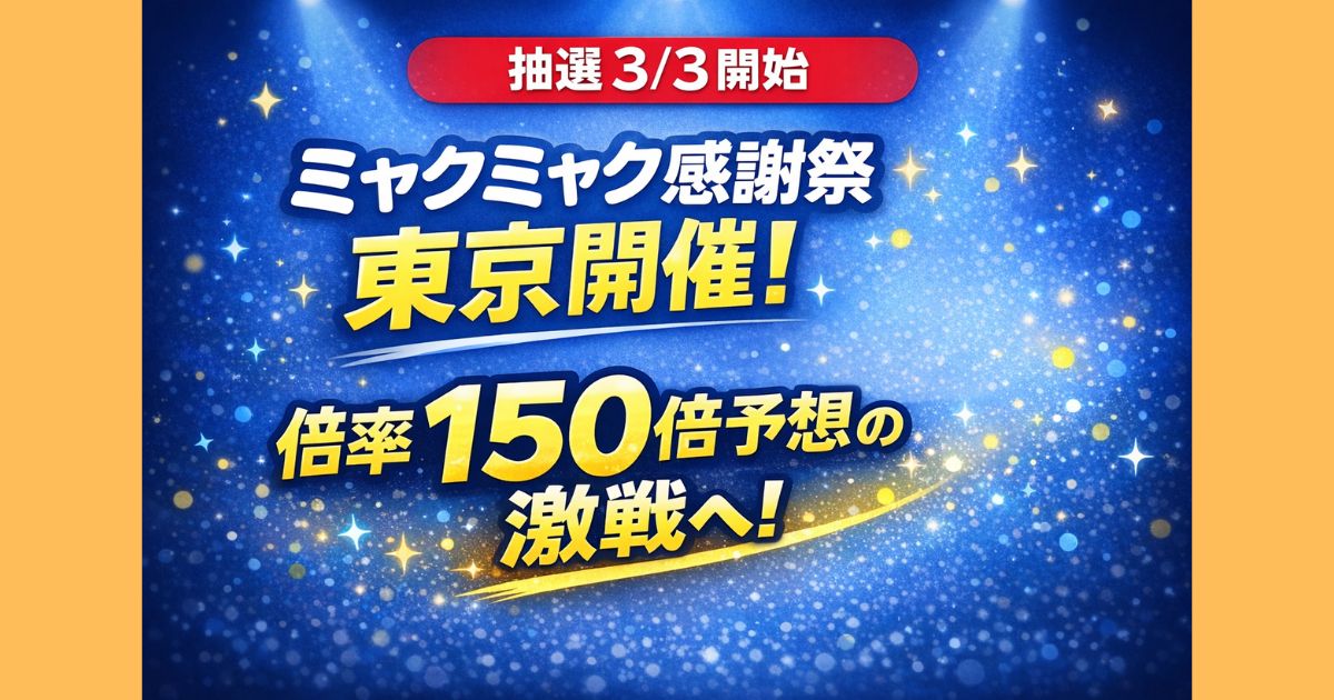 ミャクミャク感謝祭2026 in 東京はいつ開催?3月26日ニッショーホールの開催日時、抽選3/3開始の詳細、松竹梅チケットの違い、倍率150倍予想、落選対策やリセール情報まで徹底解説。