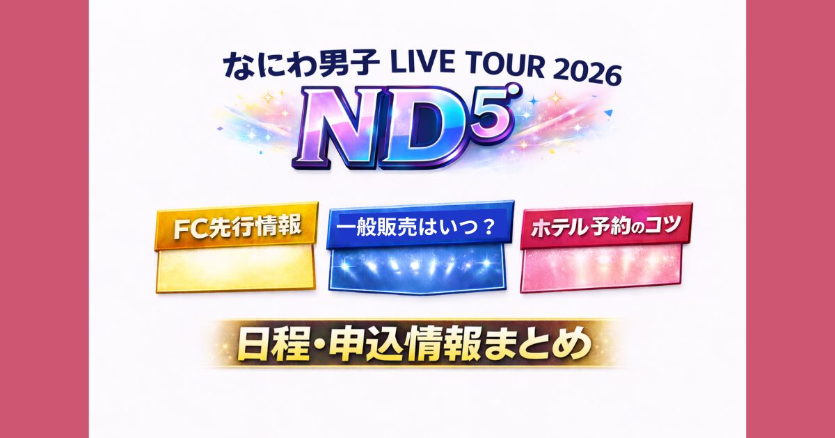 なにわ男子ライブ2026 ND⁵は4月17日からFC先行開始。当落はいつ?5月18日が有力候補とされる理由や一般販売、ホテル予約のコツを徹底解説。申込期間・日程一覧もまとめ。