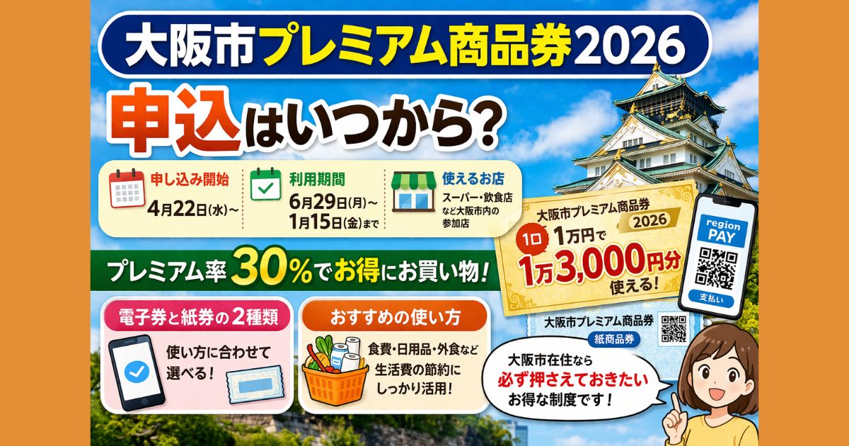 大阪市プレミアム商品券2026の申込開始日・利用期間・使える店舗をわかりやすく解説。1万円で1万3000円分使える30%還元の仕組みや、電子・紙の違い、おすすめの使い方や注意点までまとめています。