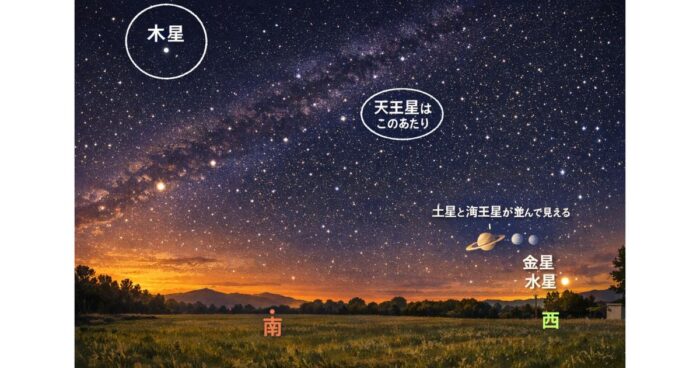 | 海王星 | 西〜南西の低空 | 機材必須 | 肉眼はほぼ不可。星図アプリ+望遠鏡で位置合わせが前提 |