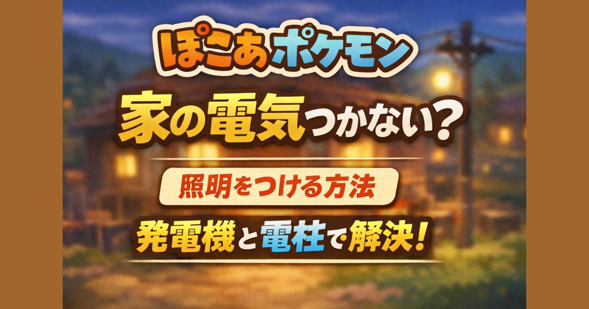 ぽこあポケモン(ぽこポケ)で家の電気がつかない原因と照明を点ける方法を解説。発電マシンと電柱の使い方、接続距離、発電ポケモンの活用まで初心者にもわかりやすくまとめました。