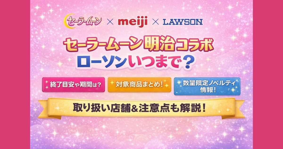 セーラームーン×明治のローソン限定コラボキャンペーン情報をまとめました。開催期間はいつまで?対象商品、先着ノベルティ(アクリルヘアゴム全10種)、取り扱い店舗や注意点を分かりやすく解説します。