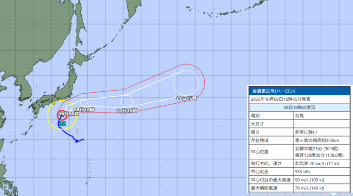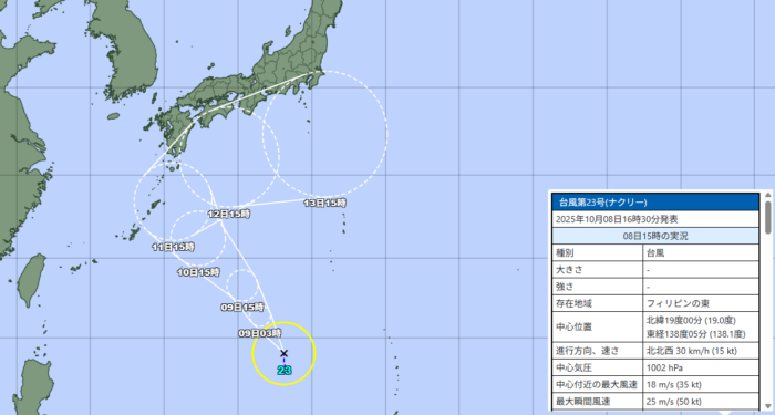 2025年10月8日午後3時、フィリピンの東で台風23号(ナクリー)が発生しました。中心気圧は1002hPa、最大風速18m/s、最大瞬間風速25m/s。北北西に進んでおり、今後日本の南海上を通って北西〜東寄りに進むとみられています。