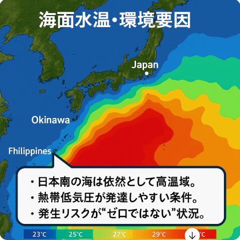 - 発生確率は低いが、海温の高さ・対流活動の強まりで短時間発達の可能性あり。