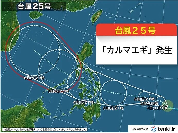 台風25号カルマエギの進路がフィリピン方面であるため、日本本州・九州・四国への直接的な接近や上陸の予想はなし。