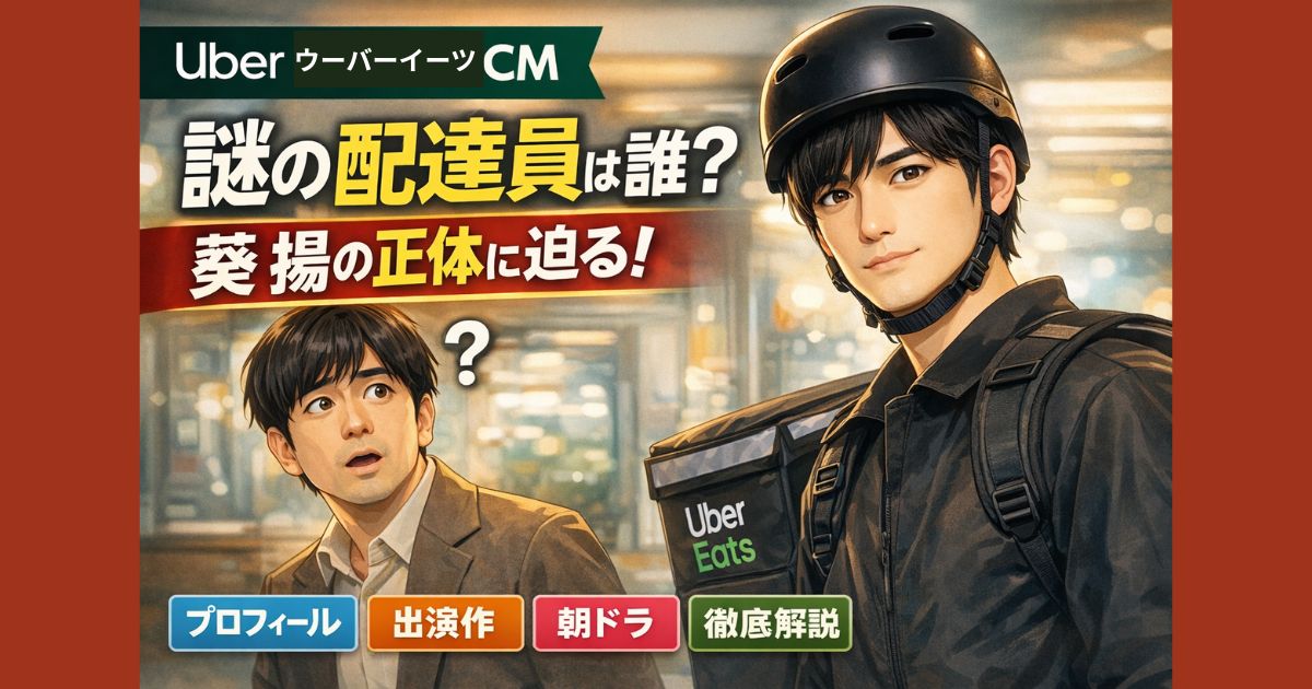 ウーバーイーツCM「角田晃広版」に登場する謎の配達員は誰?俳優・葵揚(あおいよう)のプロフィールや出演作、朝ドラ「舞いあがれ!」での役、CMでの役どころを分かりやすく解説します。